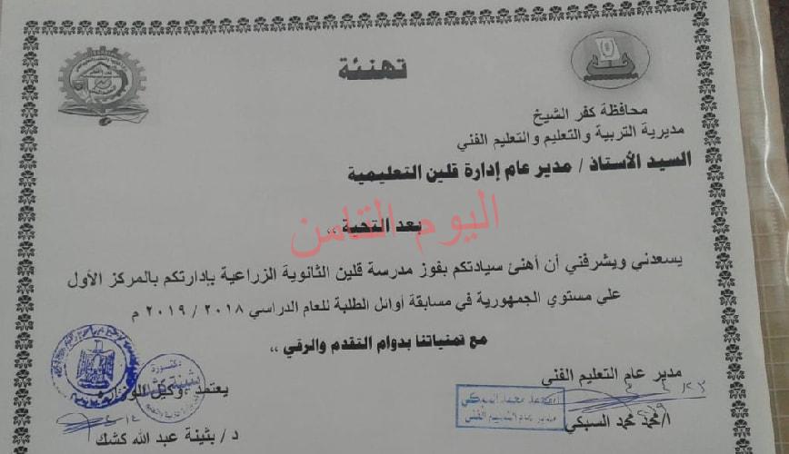 حصلت مدرسة قلين الثانوية الزراعية ومدرسة قلين الثانوية الصناعية التابعين لادارة قلين التعليمية بكفر الشيخ بقيادة محمد حسن شتا، مدير عام الإدارة بالمركز الأول علي مستوي الجمهورية في مسابقة أوائل الطلبة للعام الدراسي 2019/2018 .