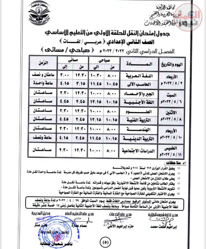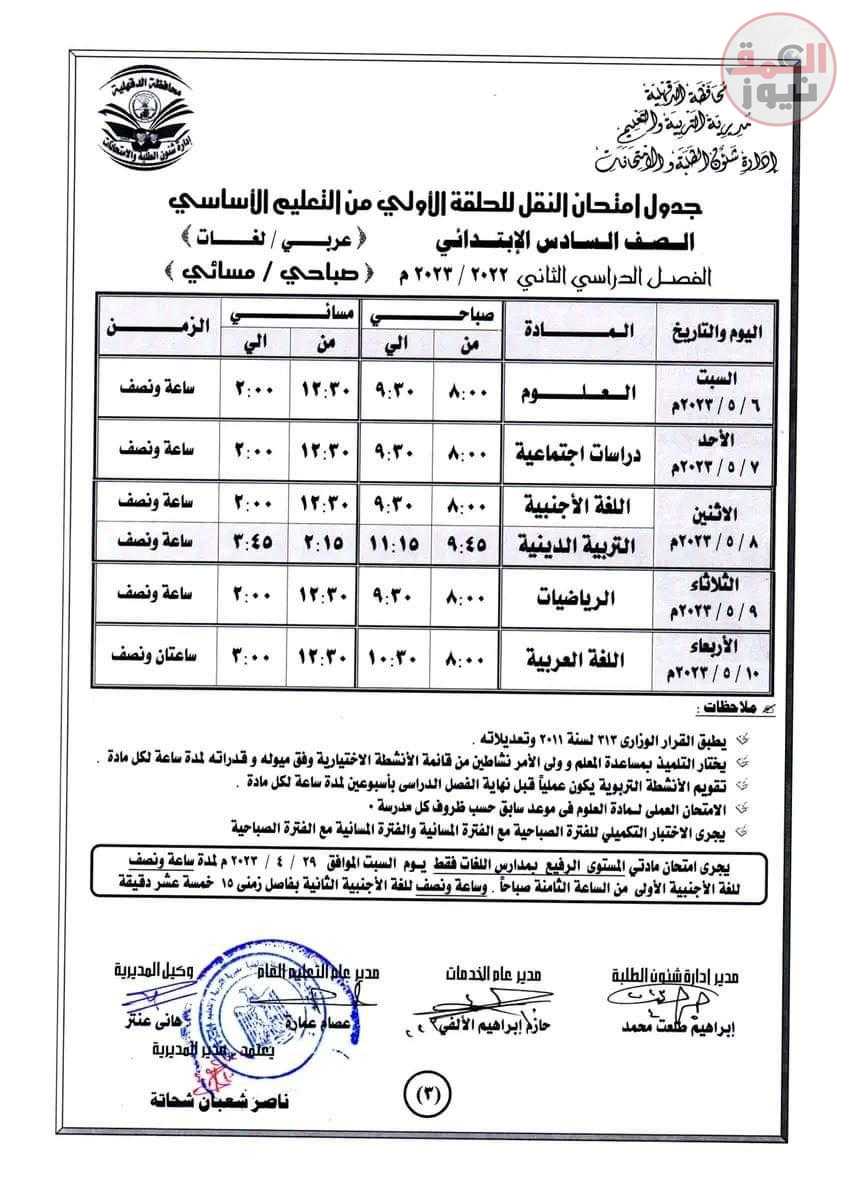 بالصور..جداول امتحانات الفصل الدراسي الثاني بصفوف النقل في محافظة الدقهلية